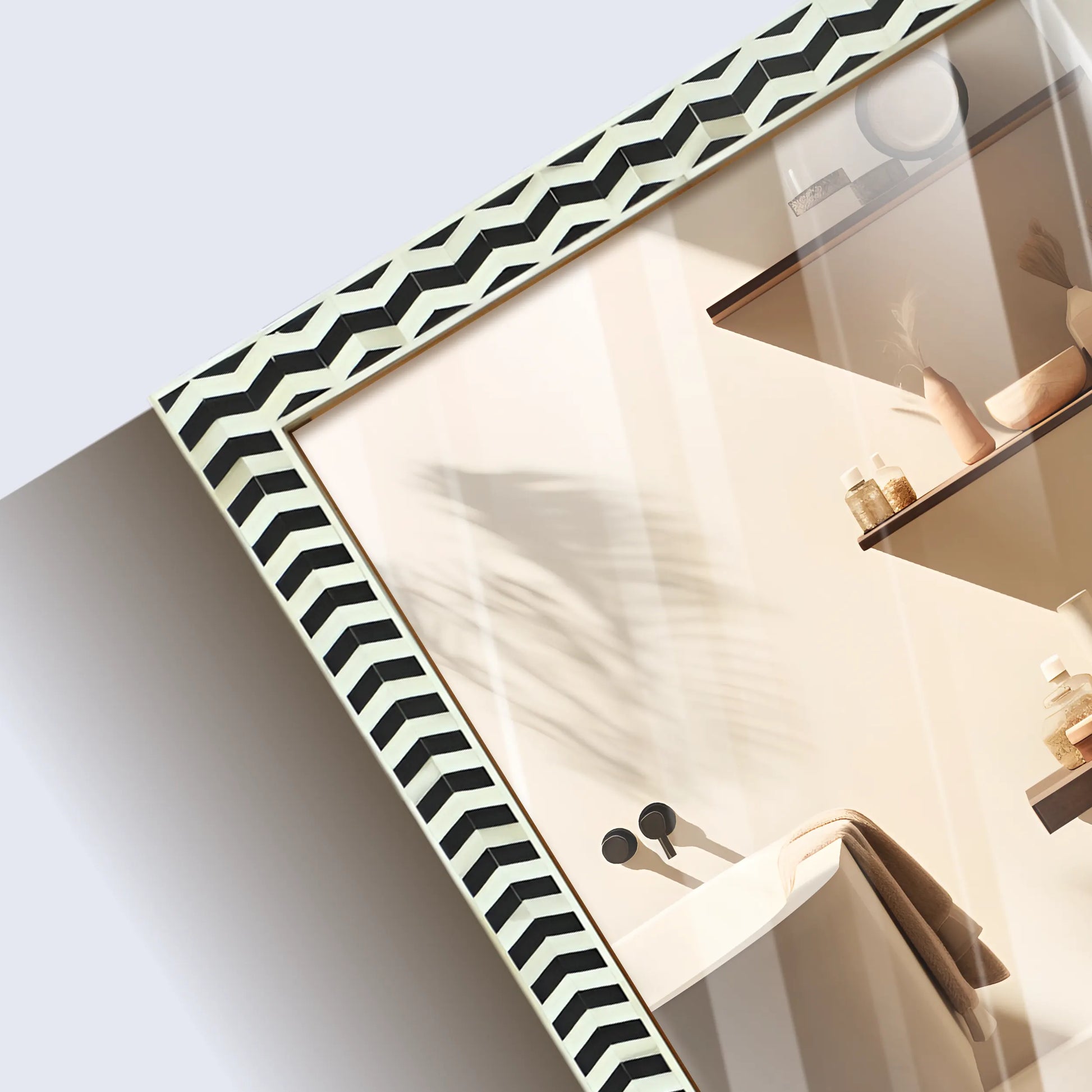 Handcrafted Bone Inlay Frame – Expertly handmade with authentic bone inlay craftsmanship, this decorative mirror features a durable pine MDF base and a stylish black-and-white herringbone pattern, offering a unique fusion of artistry & sophistication.