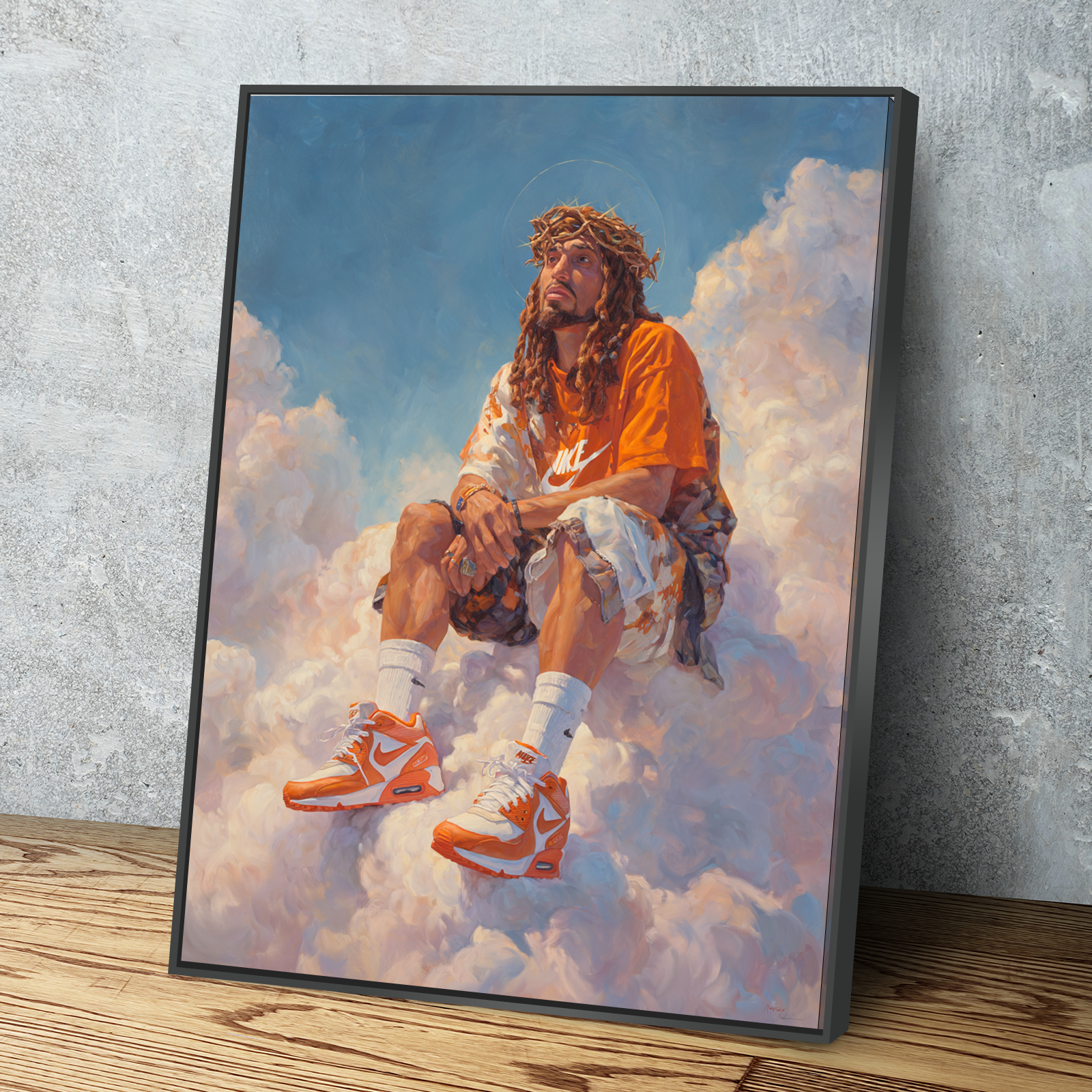 Bring bold culture and faith together with the Black Jesus Drip Canvas — a striking fusion of spirituality, style, and street culture. This one-of-a-kind artwork reimagines Jesus in a modern lens, crowned with thorns yet rocking iconic sneakers, seated among the clouds with power and presence.