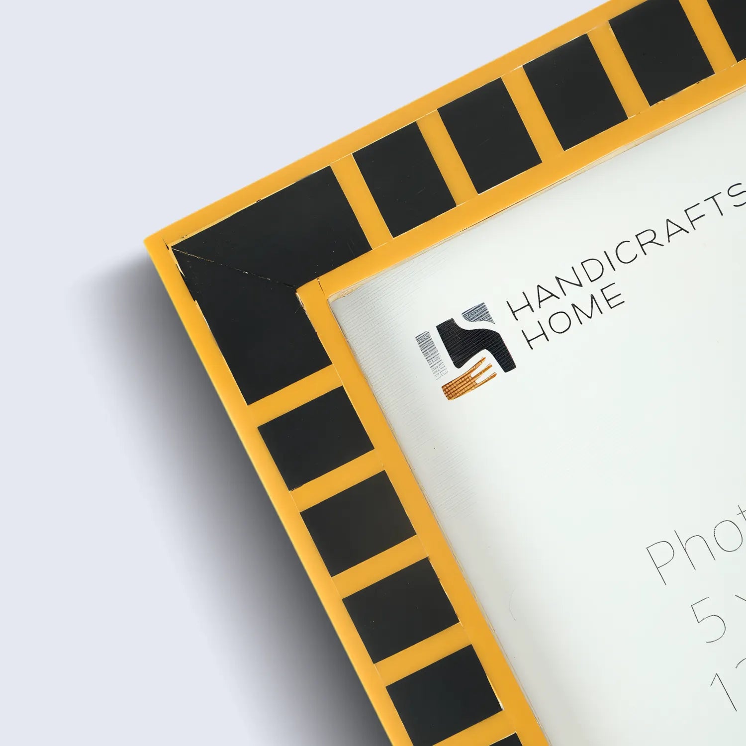 Add a vibrant touch to your decor with the Handicrafts Home 4x6 Picture Frame, showcasing a striking yellow and black resin inlay in a sleek square pattern. Set on a sturdy pine MDF base, this handcrafted frame blends artistic craftsmanship with modern style, making it a perfect addition to contemporary and eclectic interiors.