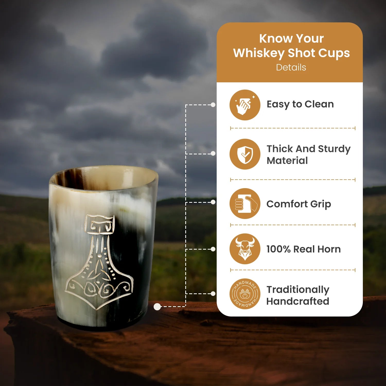 Premium Craftsmanship – Leakproof & Safe – Unlike standard glass shot glasses, our horn shot cups are sealed with a food-grade lacquer, making them safe for use and long-lasting.