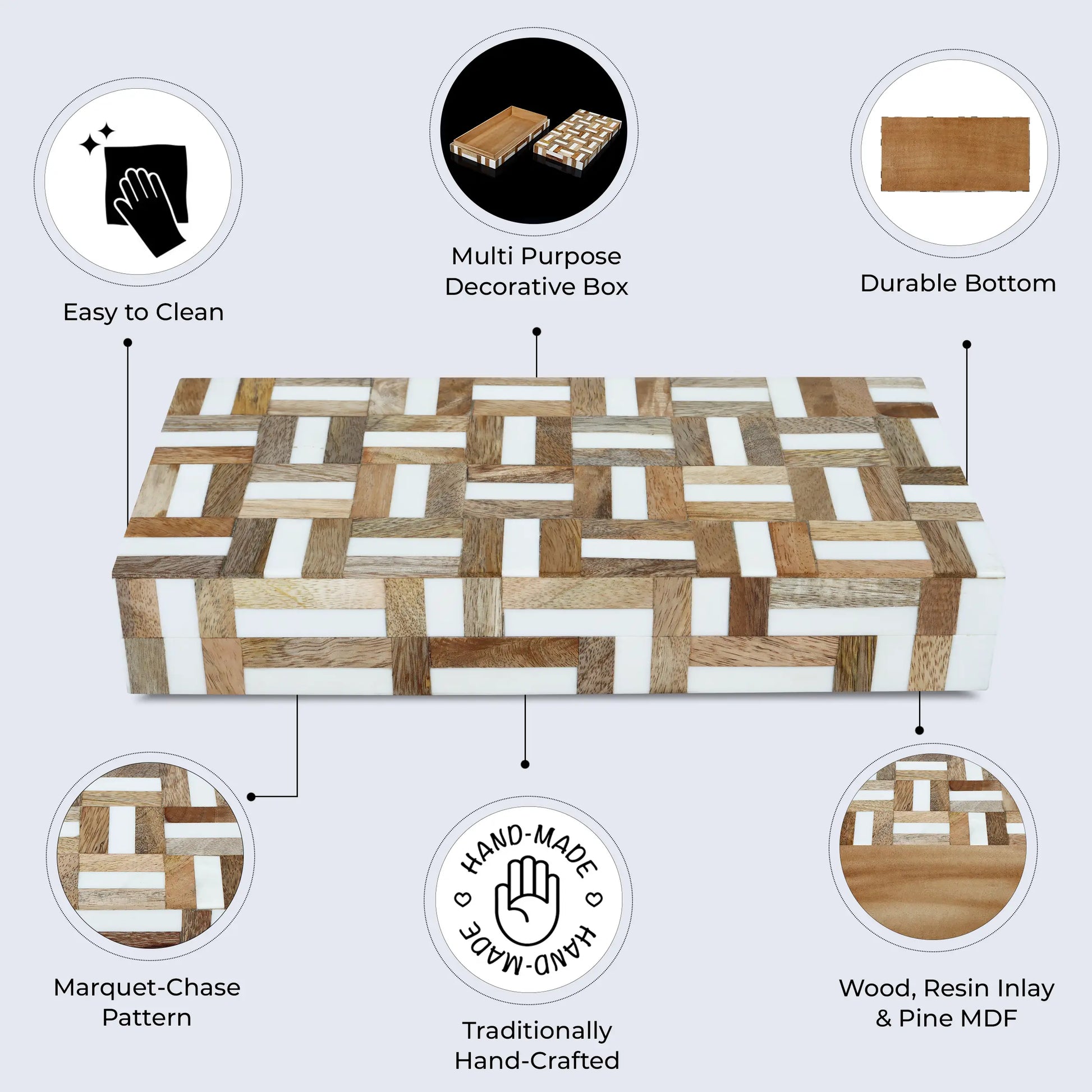 Detailed Craftsmanship – Each box is handcrafted by skilled artisans with attention to detail, resulting in a refined marquetry pattern. The mix of wood textures and white resin lines adds a visually captivating touch to your home.