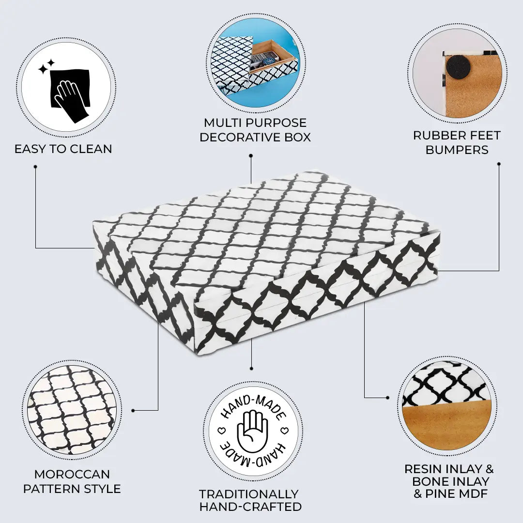 Moroccan Pattern Decorative Storage Box, Bone & Resin Inlay in 9 Sizes, Black & White