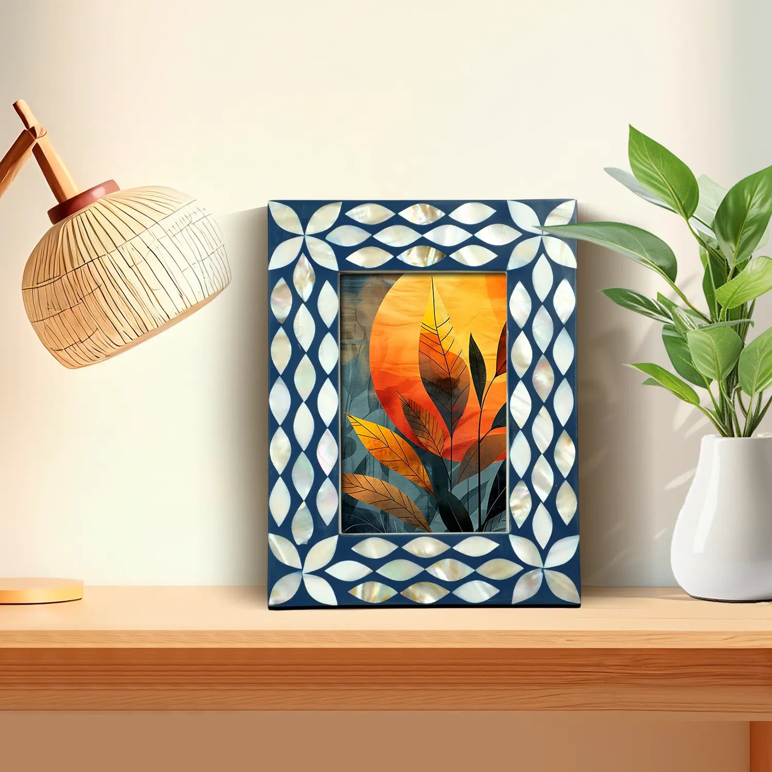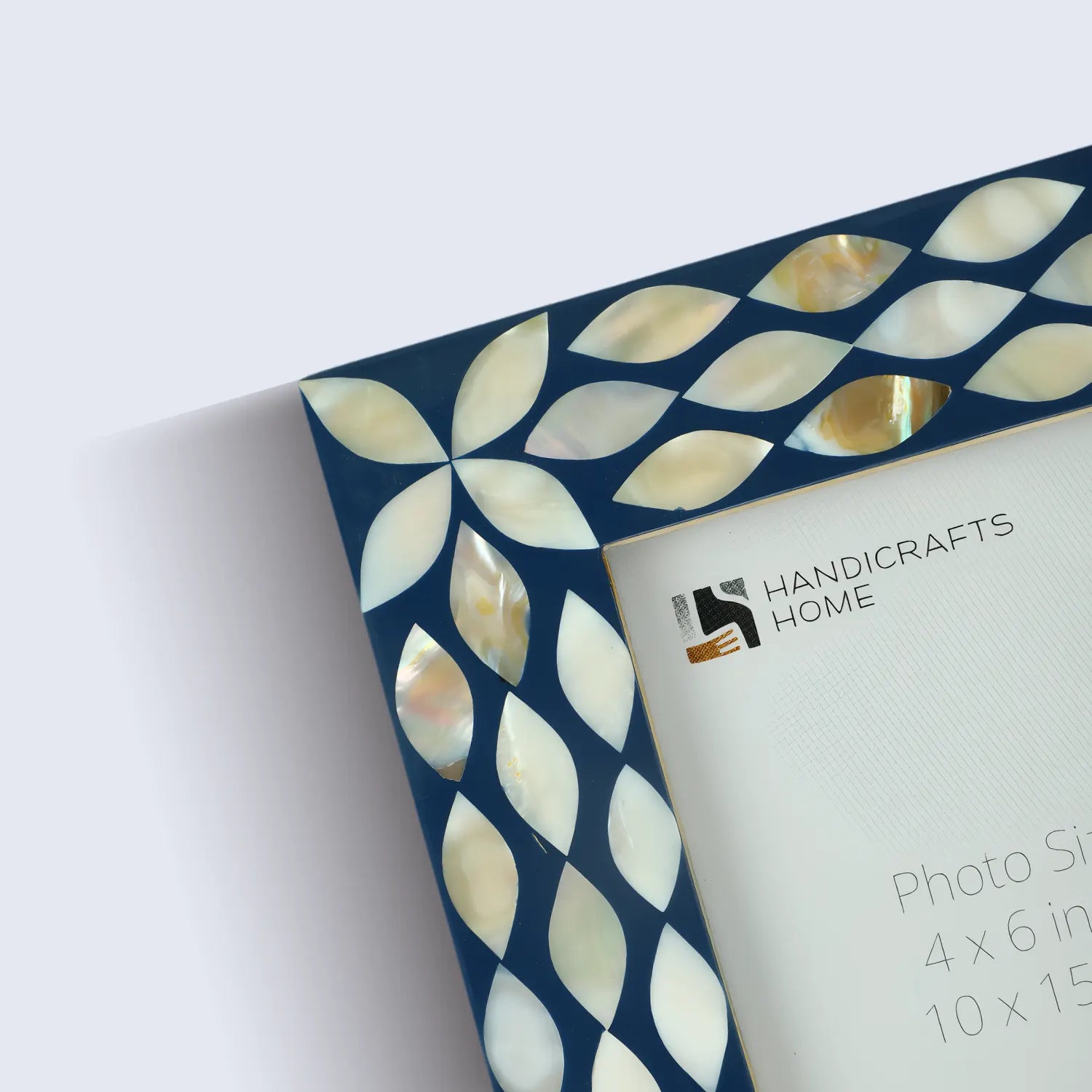 Add timeless elegance to your space with the Handicrafts Home 4x6 photo frame, meticulously handcrafted with a stunning Avant Floral pattern in rich navy blue and luminous pearl white. Featuring a refined blend of mother-of-pearl inlay and smooth resin detailing on a durable Pine MDF base, this luxury photo frame reflects artistic craftsmanship and modern charm.