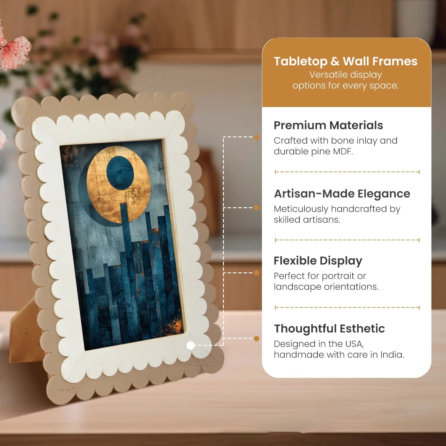 With its eye-catching scalloped edge and warm neutral tones, this decorative photo frame fits effortlessly into a range of interior styles—whether it's rustic farmhouse, cozy boho, or clean contemporary. Ideal for tabletop use or wall display, it enhances any setting, from living room walls to office shelves, bedside tables, or entryway consoles.