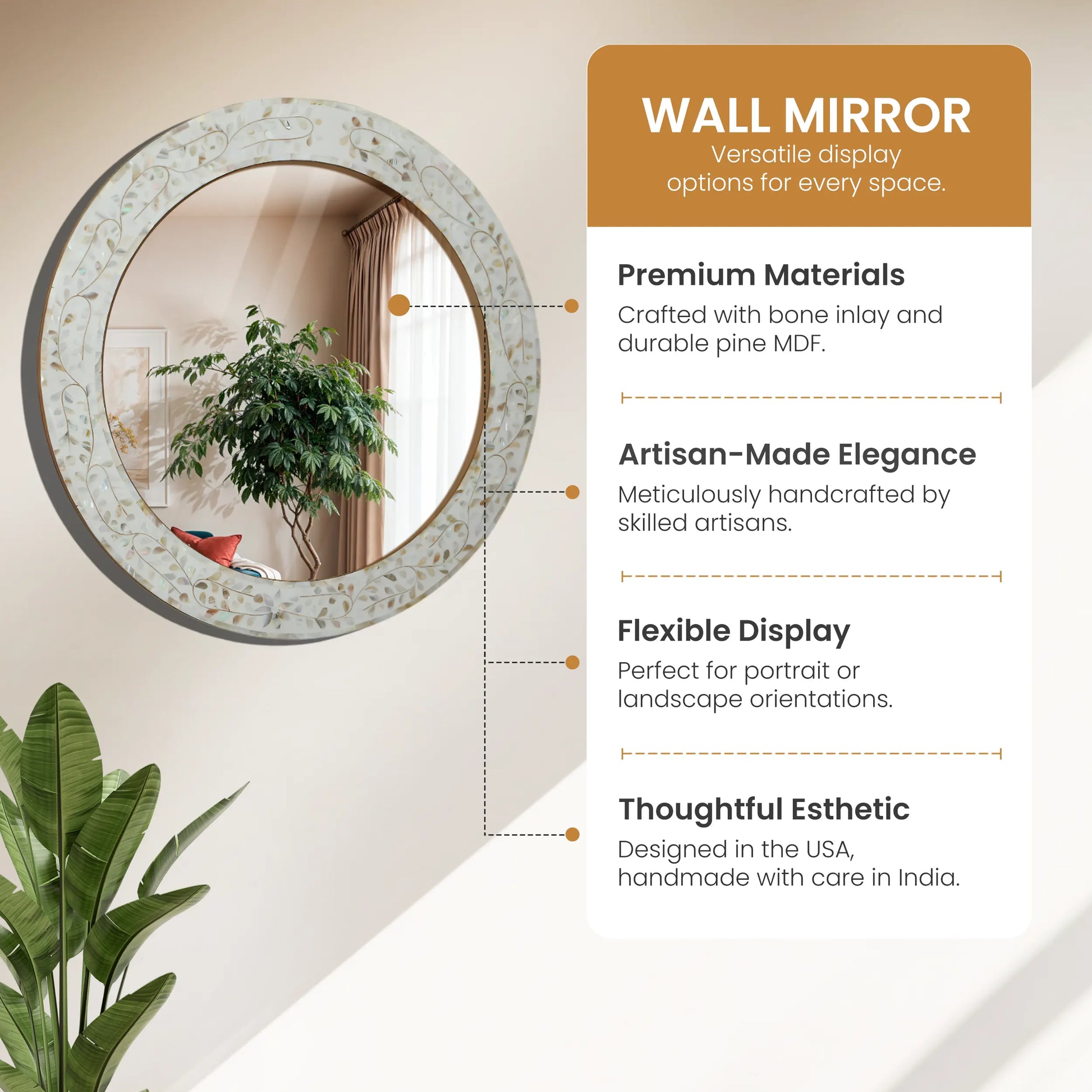 Exquisitely handcrafted with a luxurious blend of Mother of Pearl and resin inlay. Designed by skilled artisans, this stunning mirror features a soft white palette that instantly adds warmth and sophistication to any room.